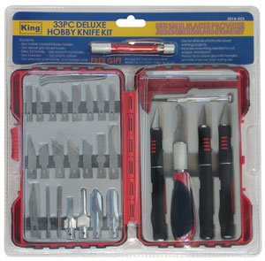 2014-0 33 pc Deluxe Hobby Knife Kit 3 pc rubber coated blades holders, 1 pc delux grip blade holder, 24 pc SK5 Blade, 2 pc scratch awl blade, 1 pc tweezers, 1 pc plastic caliper, 1 pc precision screwdriver and storage case. Pen size 6 in 1 Screwdriver slotted: 1.6, 2, 2.5mm phillips: #0, 1, 1 qty/lbs : 12/18 กก |