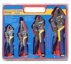 0064-0 14 pc Locking Plier Set: Sturdy 5-rivet design, sharp wire cutter at base of jaws, Nickel plated for durability, Thumb screw knob adjusts lock jaw capacity, non slip cushion grip and firm, comfortable hold. Size: 5, 6.5, 7, 10" qty/lbs : 06/35 |