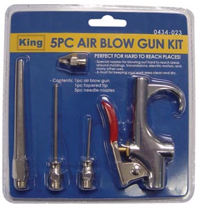 0434-0 5 pc Air Blow Gun Set 1 pc Air Blow Gun, 1 pc Tapered Tip, 3 pc needle nozzles. Perfect for hard to reach places, Nozzles for blowing out hard to reach areas around moldings, transmission, electric motors, and many other used. qty/lbs : 60/30 |