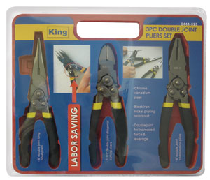 0444-0 3 pc Double Pliers Set: Chrome Vanadium Steel, Black iron-nickel plating resist rust, Double joint for increased force & leverage. 8" Double Joint Long Nose Pliers, 7.5" Double Joint Diagonal Cutting Pliers, 8" Double Joint Combination Pliers. qty/lbs : 06/18 |