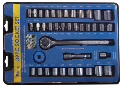 1270-0 39 pc Socket Set Chrome Vanadium Steel, 3/8" X 200 mm Ratchet handle, 3/8" X 1/4" Adaptor, 3/8" X 70 mm Extension Bar 5/32, 3/16, 7/32, 1/4, 9/32, 5/16, 1/4, 5/16, 3/8, 11/32, 3/8, 13/32, 7/16, 15/32, 1/2, 17/32, 9/16, 5/8, 11/16" 4, 4.5, 5, 5.5, 6, 6.5, 7, 7.5, 8, 8.5, 9, 10, 11, 12, 13, 14, 15 mm ` qty/lbs : 12/29 |