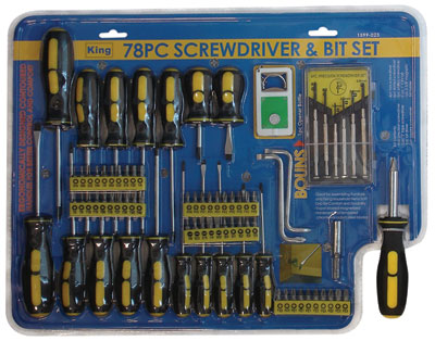 1599-0 78 pcs Screwdriver & Bit Set 6 pc precision screwdriver (#1, #0, 1.4mm, 2mm, 2.4mm, 3mm) 2 pcs "Z" type screwdriver, 1 pc bit driver, 2 pcs square screwdriver, 4 pc torx screwdriver, 6 pcs slotted screwdriver, 5 pc Phillips screwdriver, 51 pcs 1" CRV bit, 1 pc 2 3/8" magnetic bit holder, 1 pc bottle opener w/flash light. qty/lbs : 06/21 |