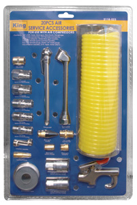 2118-0 20 pc Air Service Accessories Blow gun, 1/4" X 25' coil air hose, tire gauge, Dual head tire chuck, Blow gun nozzle, Blow gun safety nozzle, Blow gun adaptor, 1/4" male connector, 2 pc 1/4" female universal quick-connect body, Thread seal tape, Blow gun tapered nozzle, 2 pc Inflation needle, 3 pc 1/4" quick-connector plug, 2 pc 1/4" female universal quick-connect plug, 1/4" female connector. qty/lbs : 06/13 |