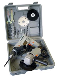 2140-0 2 pcs Set: Drill + Angle Grinder Set: 4.5" Angle Grinder: 11000rpm, 4.5 amp (500 watt) motor 4.5" Hammer Drill: 2 drill speed - 2200 & 2800rpm, 2 hammer speed - 35000 & 44000 rpm 17 pc accessories & case included: 3 size brad point drill bits, 3 size Masonry drill bits, 3 size high speed drill bits, 5 grinding stone shapes with 1/4" shank, 4.5" angle grinder disc for metal cutting, 4.5" diamond blade for tile cutting, Blade changing wrenches & chuck key. qty/lbs : 05/38 |
